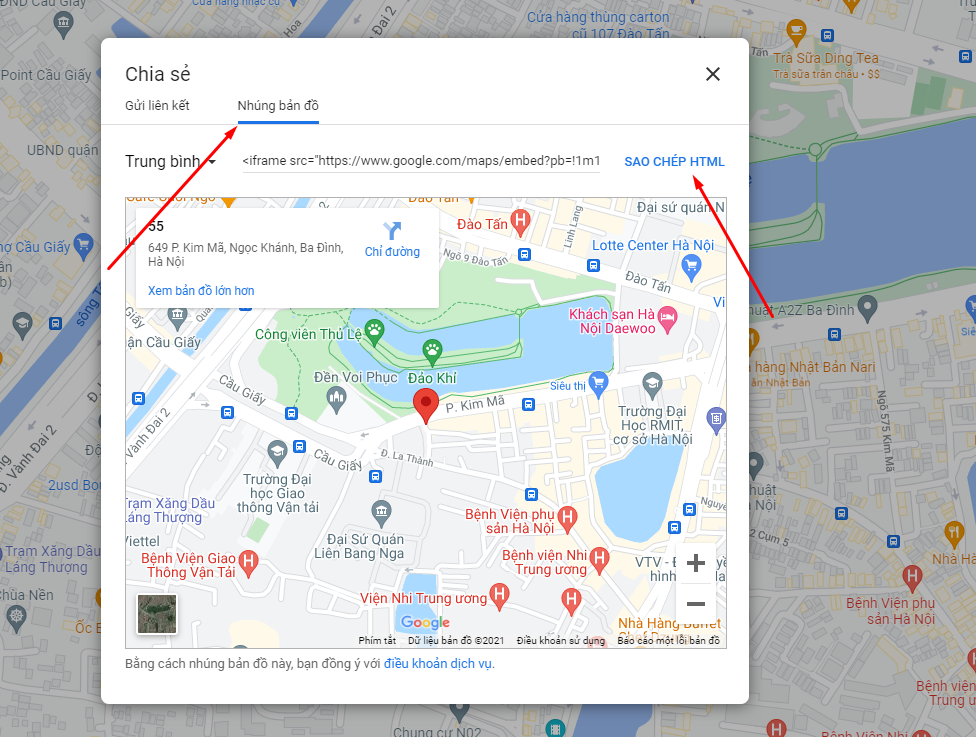 Chọn "nhúng bản đồ" => Sao chép HTML