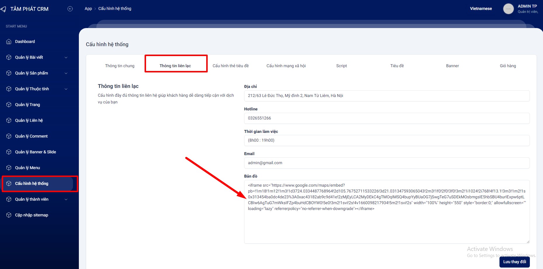 Vào Cấu hình hệ thống => Thông tin liên hệ (Tùy thuộc vào từng website sẽ có vị trí nhúng khác nhau) => Dán mã nhúng vào và chọn cập nhật