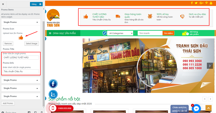 - Promo Icons sẽ hiển thị ở trên phần ảnh slide. Bạn có thể chỉnh sửa bằng các kích chọn để thay đổi icon và đường dẫn url