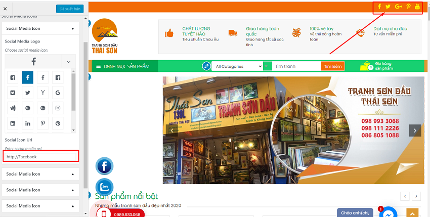 - Social Media Icons sẽ hiển thị ở góc trên cùng bên phải trang chủ. Bạn có thể chỉnh sửa bằng các kích chọn để thay đổi icon và đường dẫn url