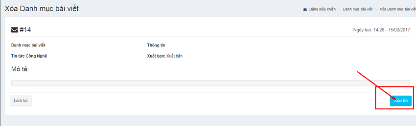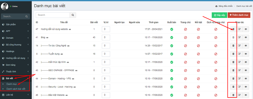 Bước 2: Chọn danh mục cần xóa và Click nút xóa của danh mục bạn muốn xóa.