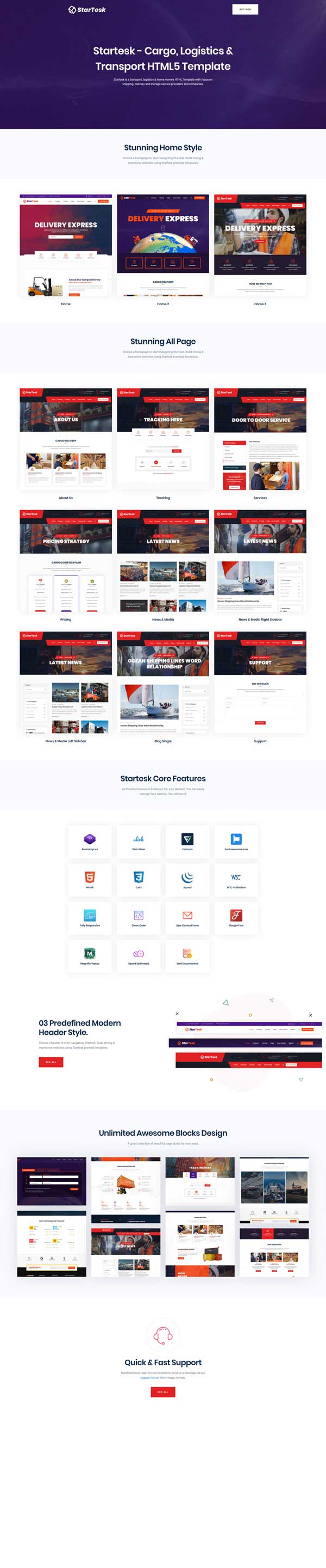 Startesk is a customized and responsive HTML template for transport, logistics, delivery, moving & cargo websites. The best of all features, the pages are optimized for Load Speed. It is focused on building business websites in Transport, Transportation, Logistic company niches. We designed detailed homepage layouts that will fit any transportation industry size. It is the most complete solution for your next website as it covers every aspect of a transport company website. Startesk is fully-responsive template based on Modern Trends, CSS3 and Bootstrap 4.0+