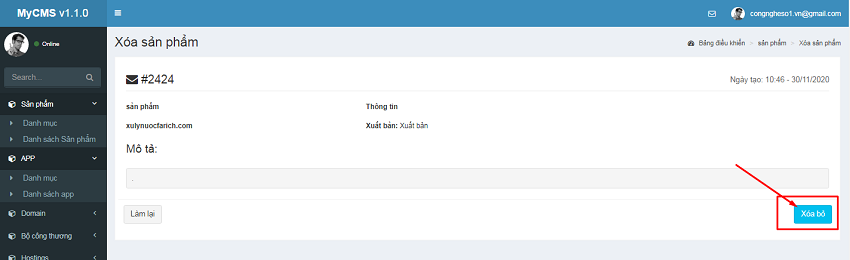Bước 2: Click vào nút Xóa sản phẩm ở trên