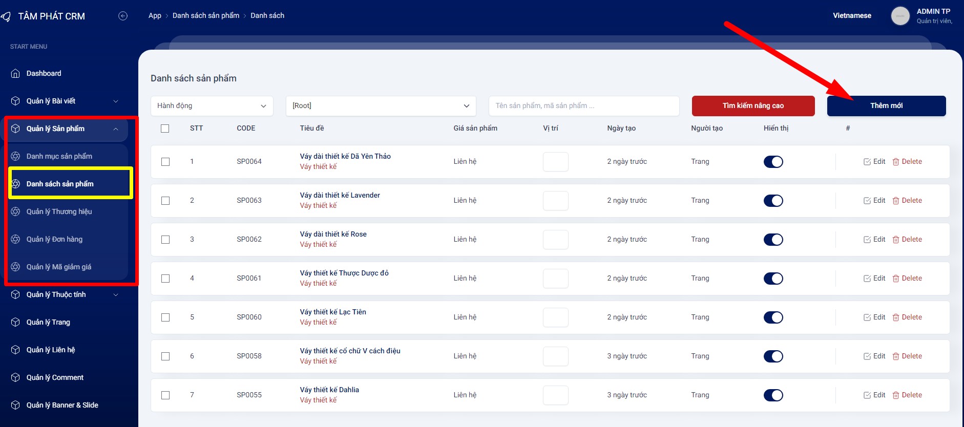Bước 2: Từ trang Sản phẩm chọn nút Thêm mới