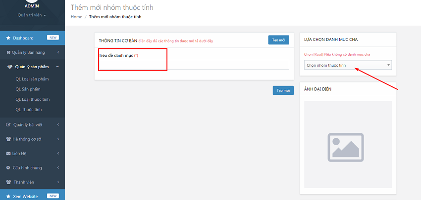 Bước 3: Nhập tên thuộc tính và chọn nhóm thuộc tính > Tạo mới.
