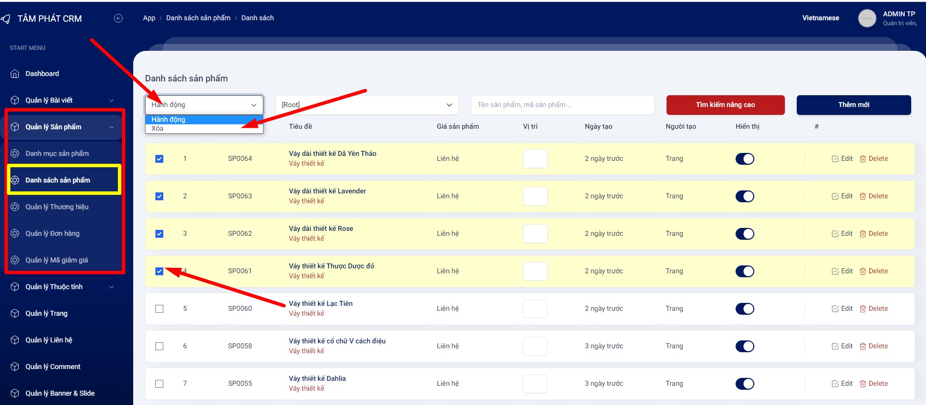 xóa nhiều sản phẩm trong cùng 1 thời điểm.