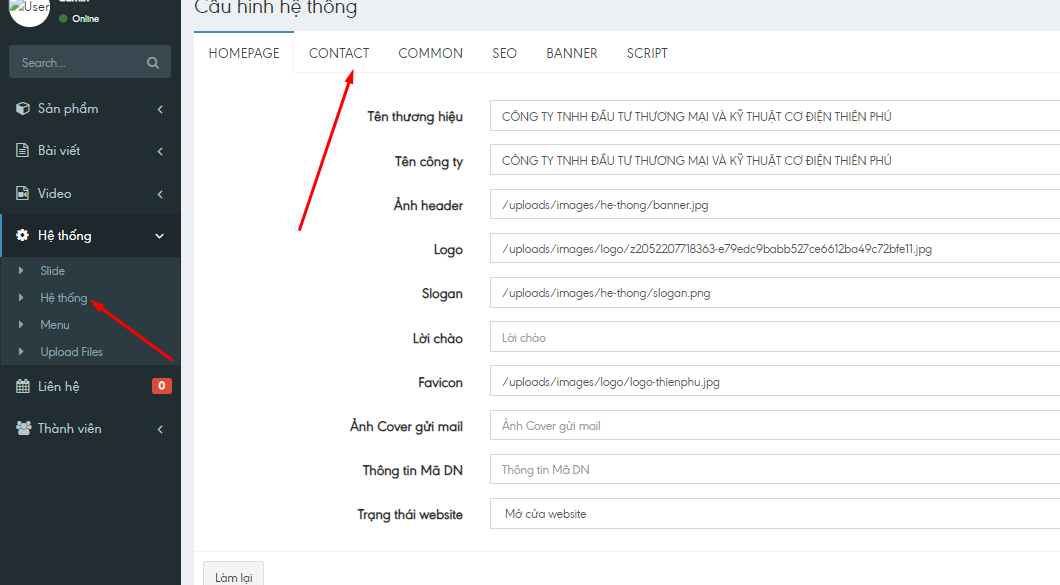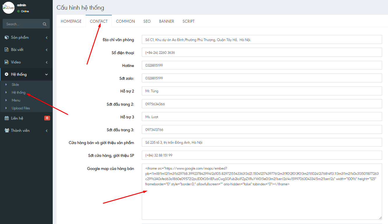 Vào "hệ thống" => Contact (Tùy thuộc vào từng website sẽ có vị trí nhúng khác nhau) => Dán mã nhúng vào và chọn cập nhật