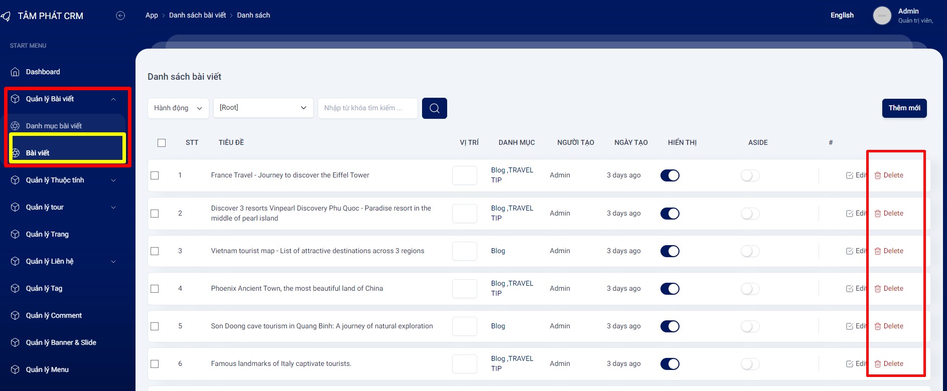 Bước 2: Chọn bài viết cần xóa và Click nút xóa của bài viết bạn muốn xóa.