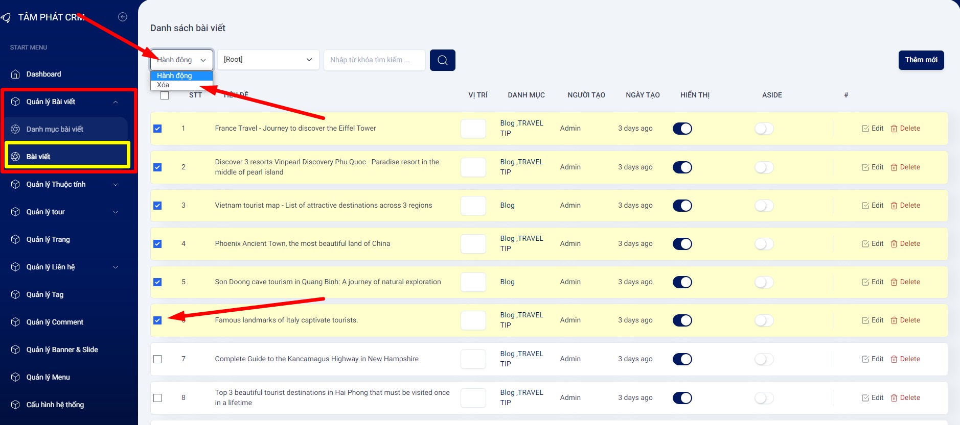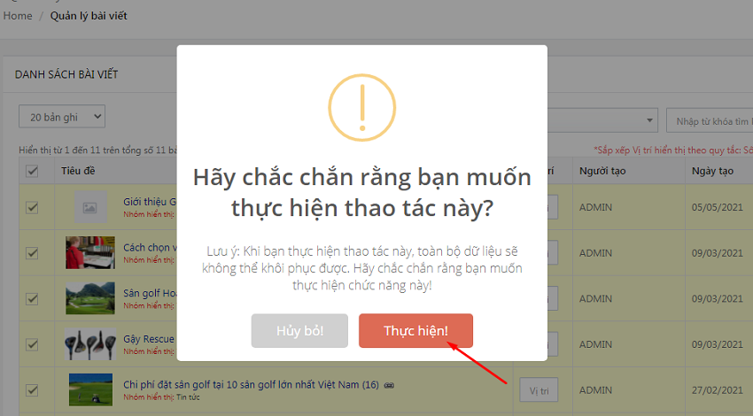 Lưu ý: Bạn có thể xóa nhiều bài viết 1 lúc bằng cách: Tích chọn bài viết cần xóa => Chọn nút Hành động => Xóa ở góc trái để xác nhận