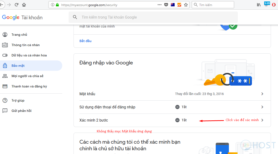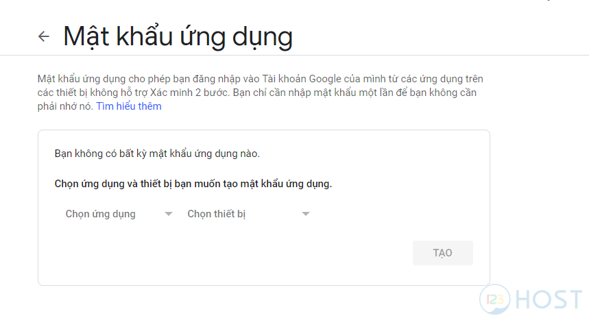 Giao diện không thấy mục tạo mật khẩu ứng dụng ( Do chưa bật xác thực 2 bước)