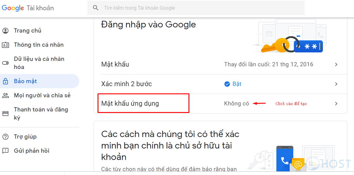 Để tạo mật khẩu ứng dụng Gmail ta làm theo các bước sau: