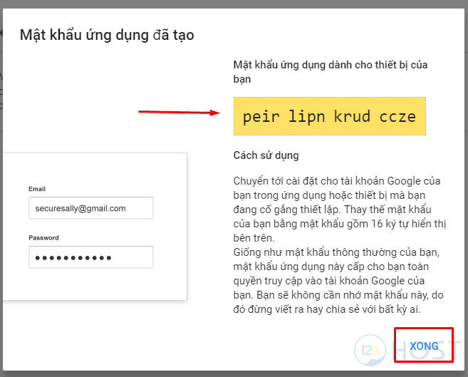 Nhấn Xong để kết thúc quá trình tạo mật khẩu ứng dụng cho gmail