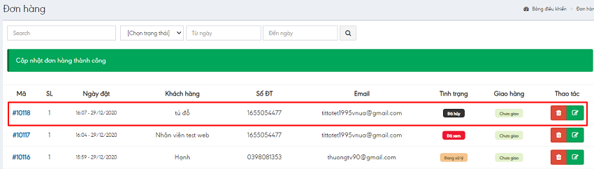 Bước 2: Ở phần danh sách đơn hàng, chọn nút xóa ở bên phải đơn hàng