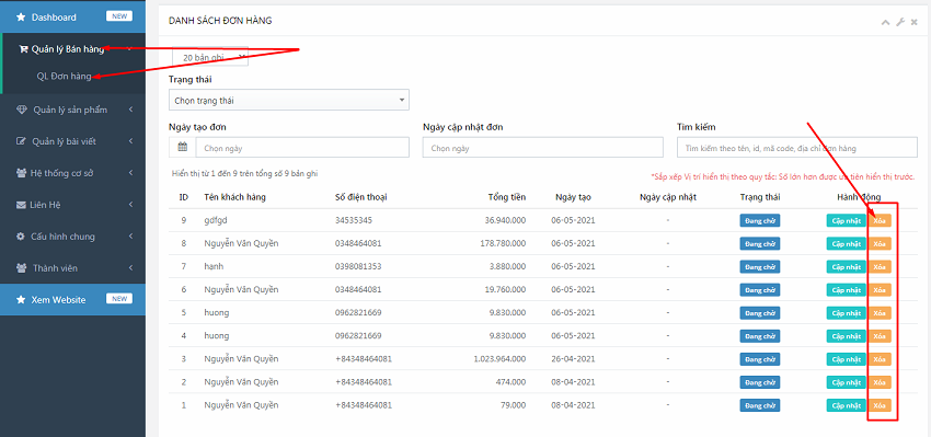 Bước 1: Truy cập vào trang quản trị website, chọn Quản lý bán hàng và chọn tiếp QL Đơn hàng, click nút Cập nhật