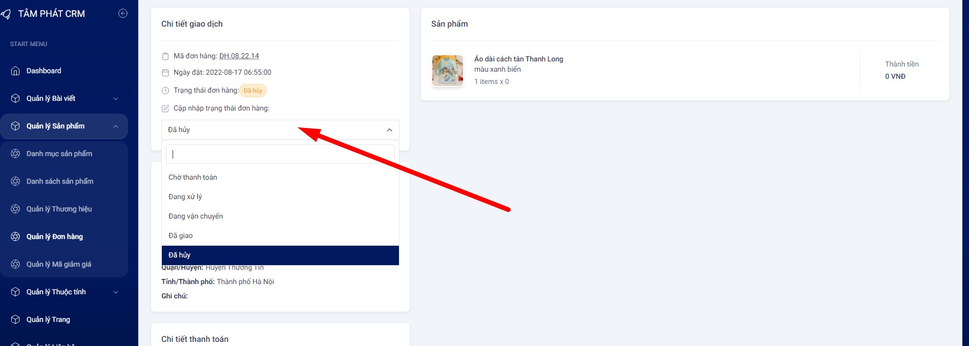 Bước 2: Tại trang đơn hàng, click chuột vào nút phần Tình trạng, chọn Đã hủy