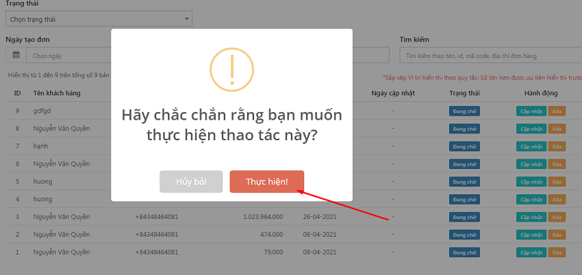 Bước 3: Hệ thống sẽ nhảy sang 1 trang xác nhận hiện ra hỏi lại lần nữa bạn có muốn xóa không ---> nếu có click Thực hiện