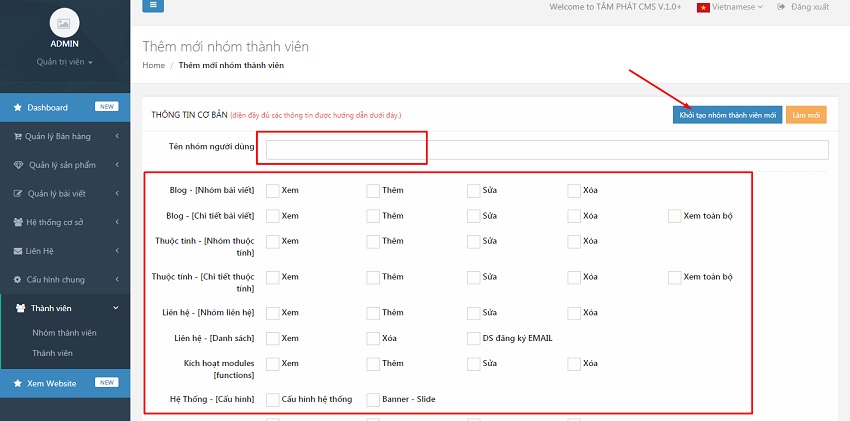 Tại đây bạn sẽ tích chọn các chức năng sẽ phân quyền cho nhóm thành viên, với những chức năng không muốn phân quyền bạn sẽ không thực hiện tích chọn.