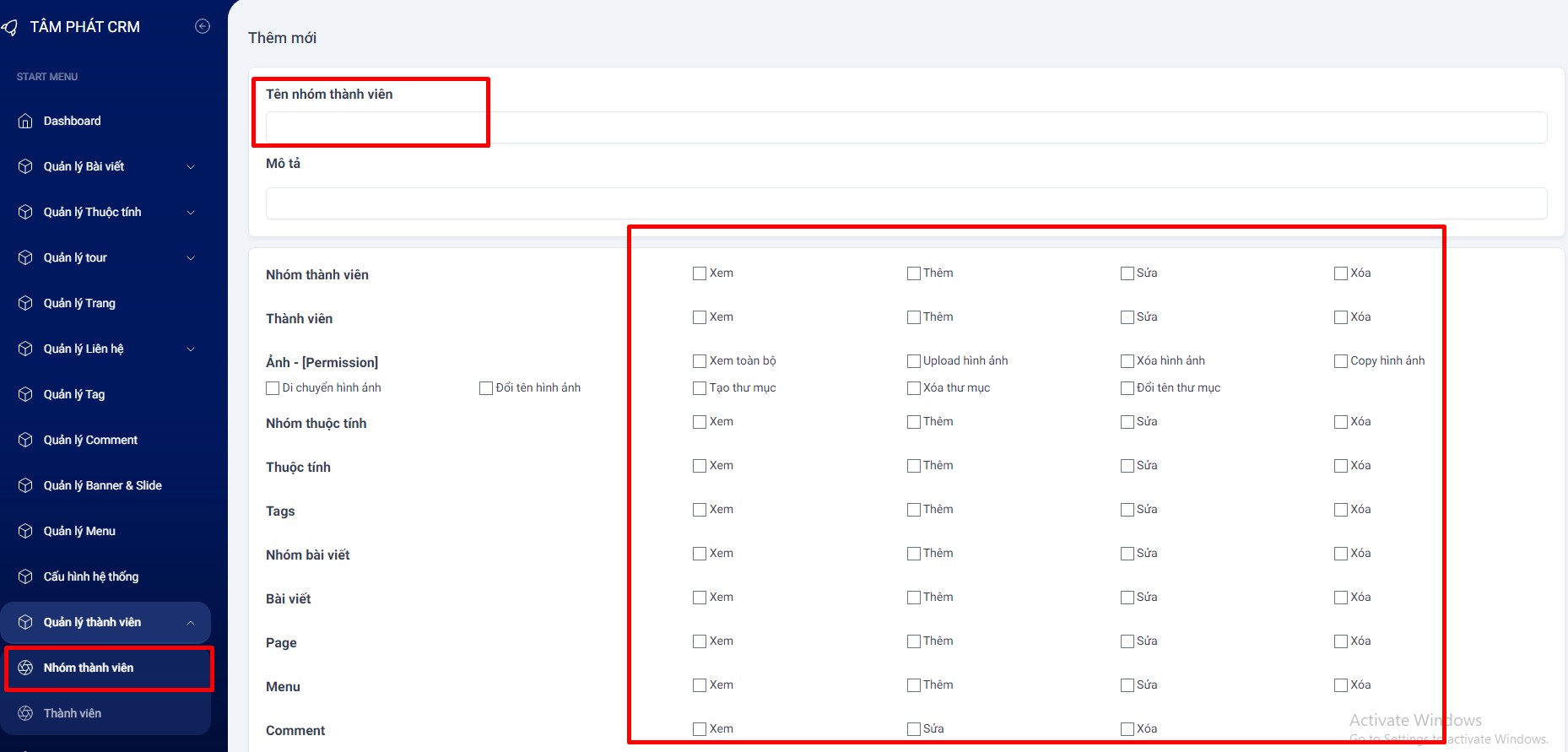 Tại đây bạn sẽ tích chọn các chức năng sẽ phân quyền cho nhóm thành viên, với những chức năng không muốn phân quyền bạn sẽ không thực hiện tích chọn.