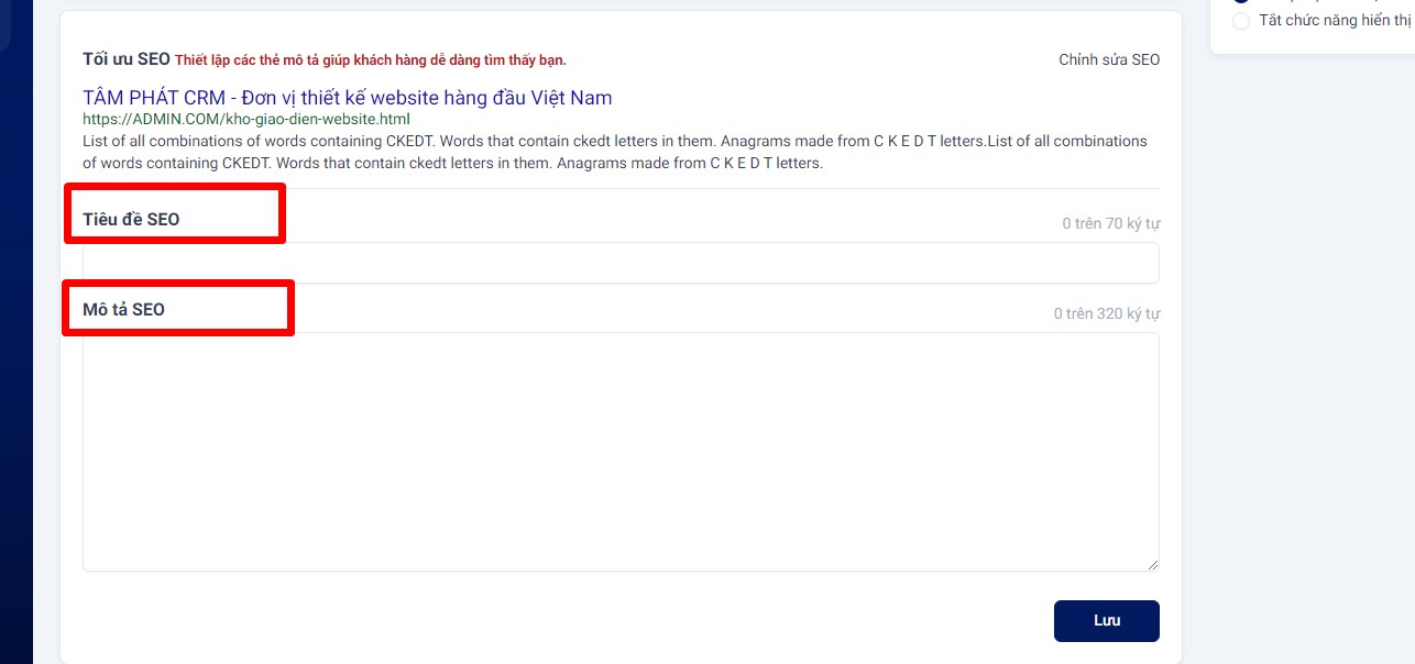 Hầu hết khách hàng đều tìm kiếm nội dung bằng cách sử dụng các công cụ tìm kiếm như Google hoặc Bing. Bạn có thể thay đổi cách hiển thị nội dung tiêu đề, mô tả trang nội dung của bạn trên các công cụ tìm kiếm bằng cách chỉnh sửa SEO website tại phần này.