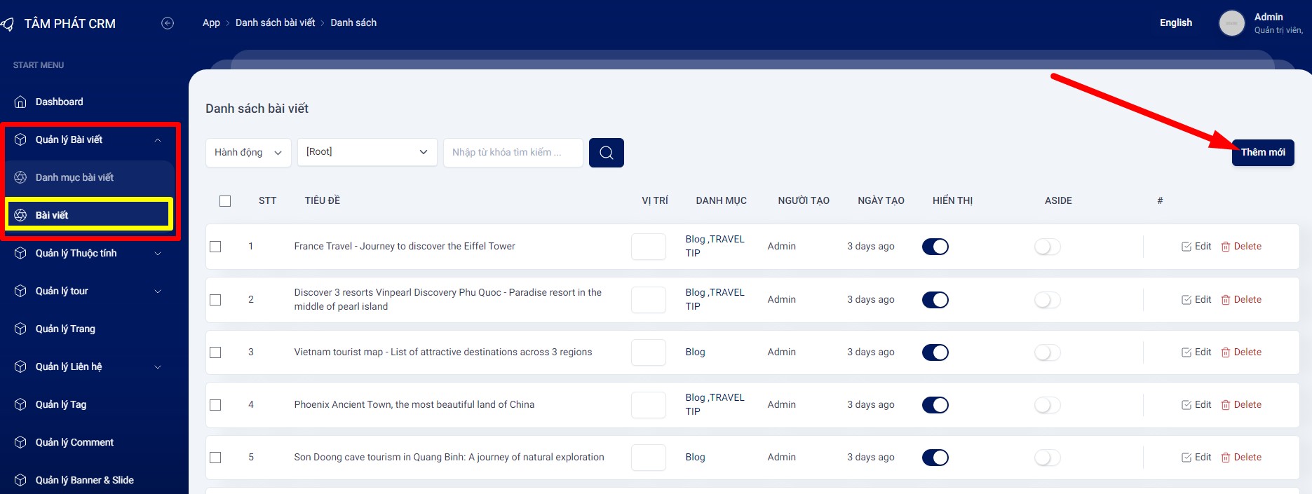 Bước 2: Trong phần Danh sách bài viết, click vào nút