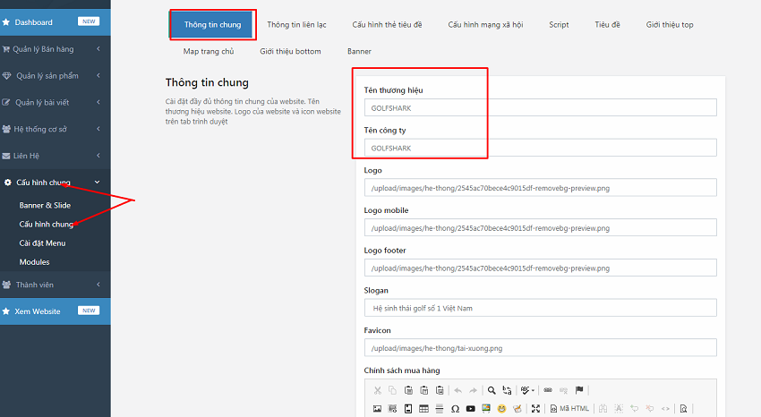 Thông tin chung, bạn có thể chỉnh sửa Tên thương hiệu, công ty, hình ảnh logo, favicon,....