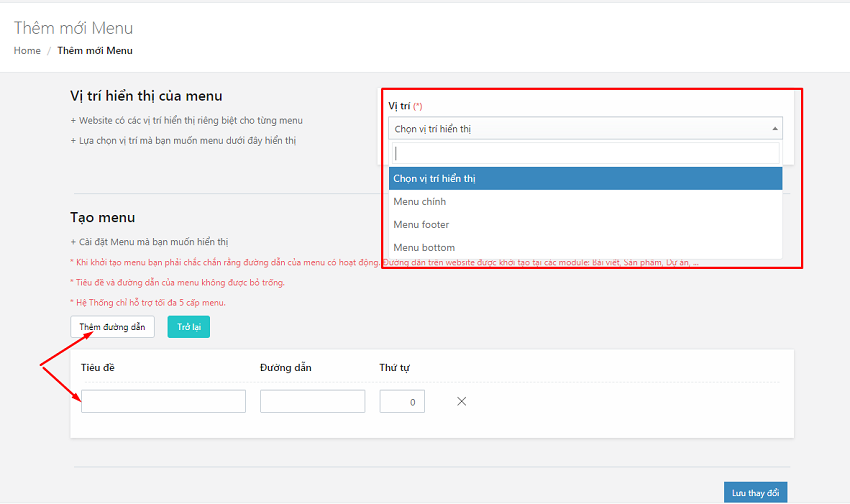 Bước 3: Điền vị trí menu > chọn nút Lưu thay đổi