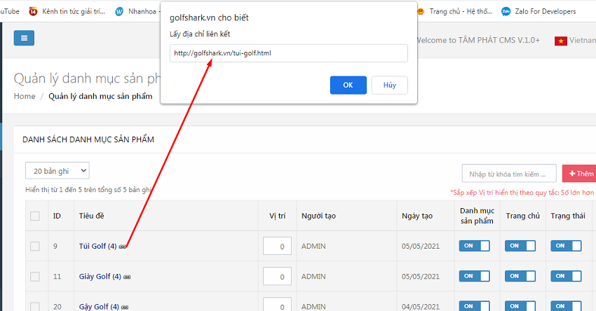 Mở 2 tab để thêm dễ hơn. 1 tab là danh mục thuộc phần loại sản phẩm (hoặc nhóm bài viết), 1 tab là menu thuộc hệ thống.