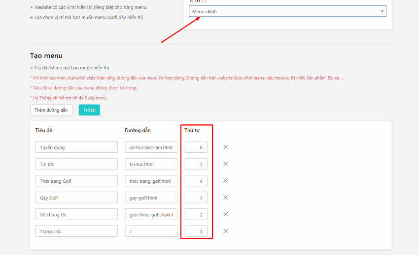 Bước 2: Tại trang thêm mới, bạn chọn Thêm đường dẫn, chọn vị trí hiển thị menu. Sau đó điền tên và đường dẫn menu