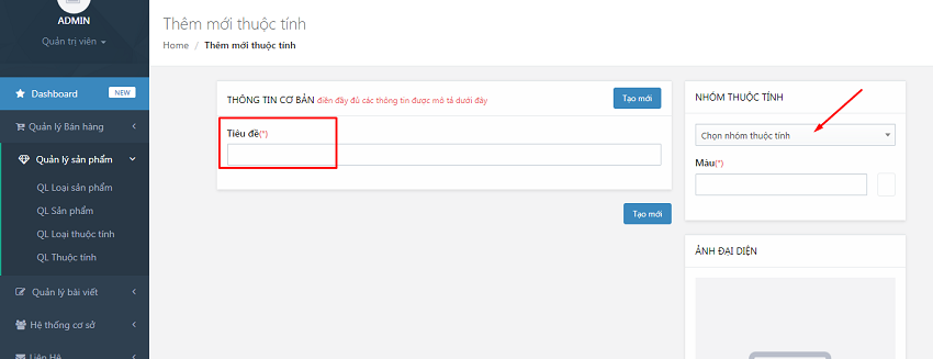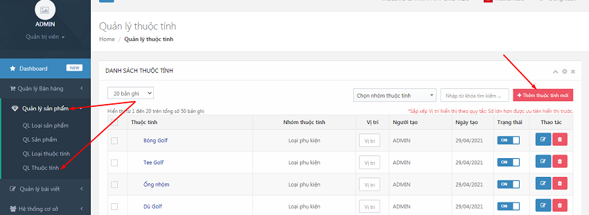 Bước 1: Tại phần quản trị web, nhấp chuột vào QL Sản phẩm, chọn QL Thuộc tính