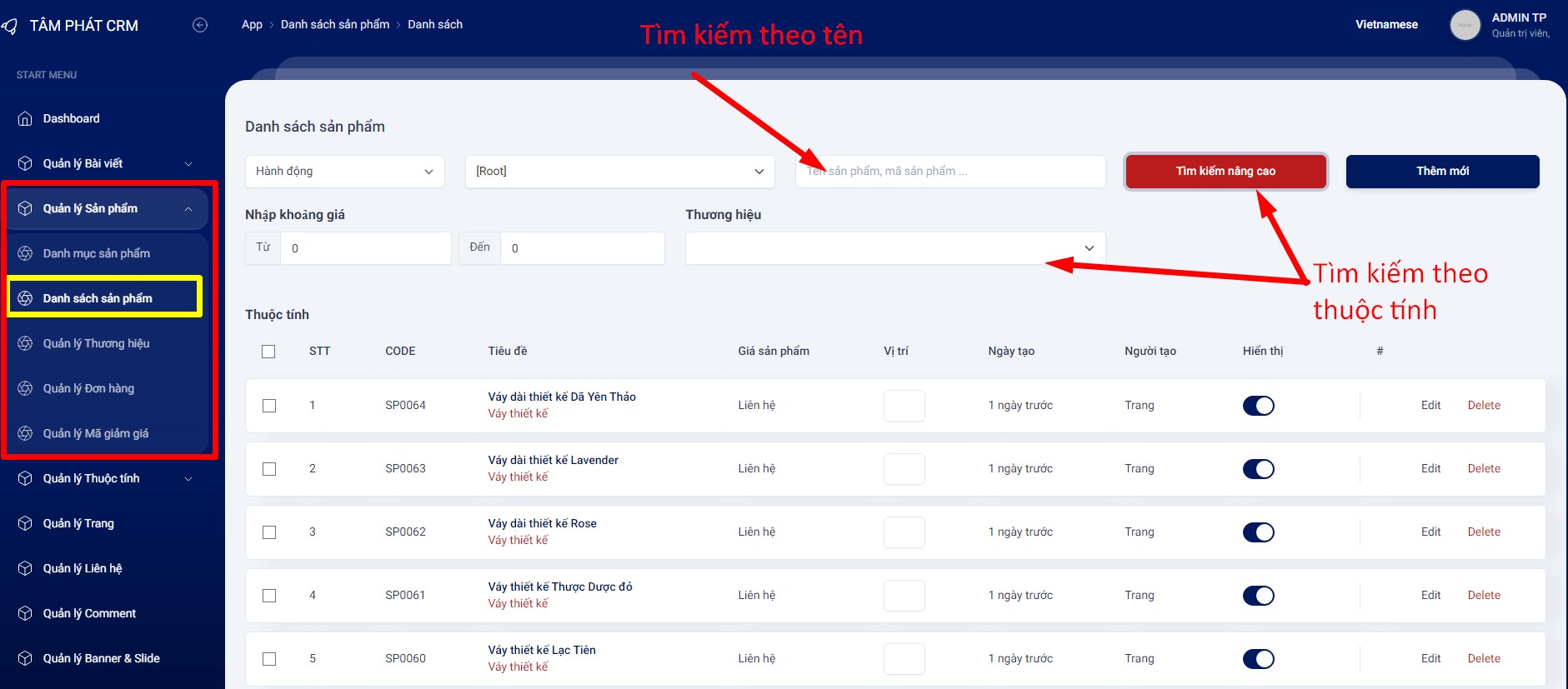 Ngoài ra, bạn cũng có thể thực hiện tìm kiếm sản phẩm theo tên, theo thuộc tính
