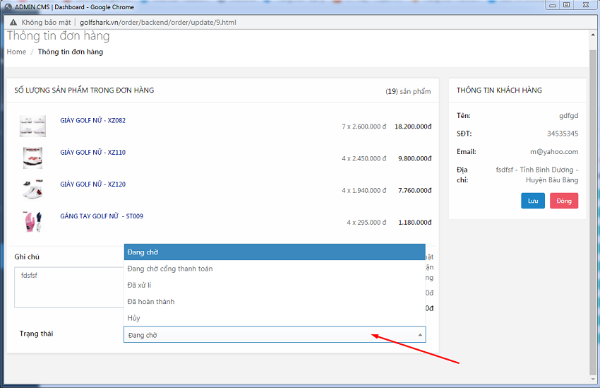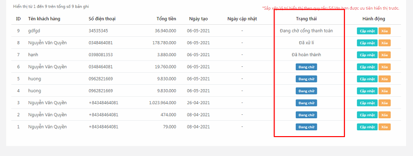 Bước 2: Tại trang đơn hàng, click chuột vào nút Cập nhật để thực hiện xác nhận đơn hàng