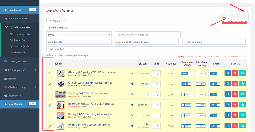 xóa nhiều sản phẩm trong cùng 1 thời điểm.