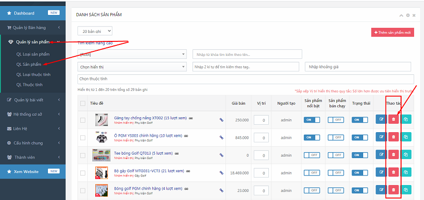 Bước 2: Click vào nút Xóa sản phẩm ở trên